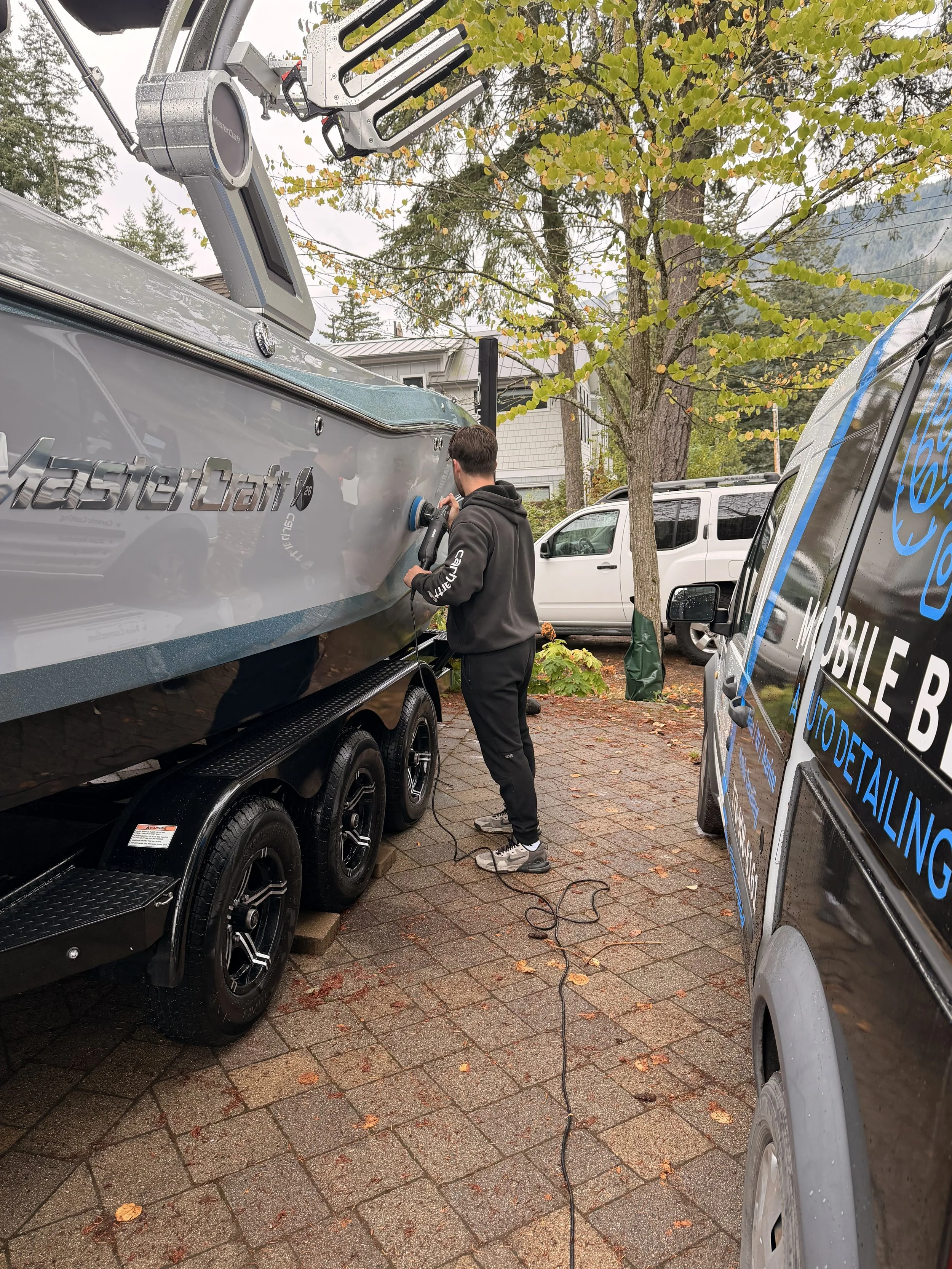 Boat gelcoat and marine paint take a beating from sun, salt, algae, water spots, and dock grime—so regular washing alone won’t keep the finish looking new. Our ceramic coating and polishing for boats restores clarity and shine, then seals the exterior with long-term protection for a deep gloss finish that lasts. The coating creates a slick, hydrophobic surface that helps repel water, oxidation, and staining, making your boat easier to clean with less scrubbing and fewer harsh chemicals. Ideal for boat owners who want a sharper look, reduced maintenance, and better protection for the hull, topsides, and exterior surfaces all season long.